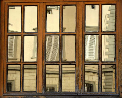 Wow! A piece of art. I love the old wood of the windows, the colors, and of course, the somewhat distorted reflection. It was a nice choice to crop it like this.
